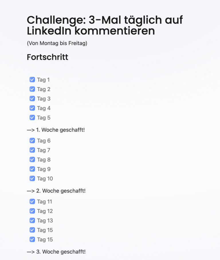 Deshalb hatte ich eine Checkliste, auf der ich jeden Tag abgehakt habe, wenn ich drei Kommentare geschafft hatte: